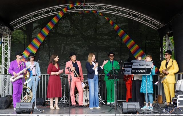 Im Anschluss präsentierte Brazzo Brazzone dann gemeinsam mit allen Kindern auf und vor der Bühne unseren Courage-Rap dem Publikum – ein unvergesslicher verbindender Moment für uns alle!