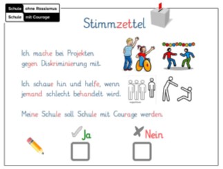 3. Ich setze mich dafür ein, dass an meiner Schule ein Mal pro Jahr ein Projekt zum Thema Diskriminierungen durchgeführt wird, um langfristig gegen jegliche Form von Diskriminierung, insbesondere Rassismus, vorzugehen. Wir beschäftigen uns gleichermaßen mit Diskriminierung aufgrund der Religion, der sozialen Herkunft, des Geschlechts, körperlicher Merkmale, der politischen Weltanschauung und der sexuellen Orientierung. Darüber hinaus wenden wir uns gegen alle totalitären und demokratiegefährdenden Ideologien.