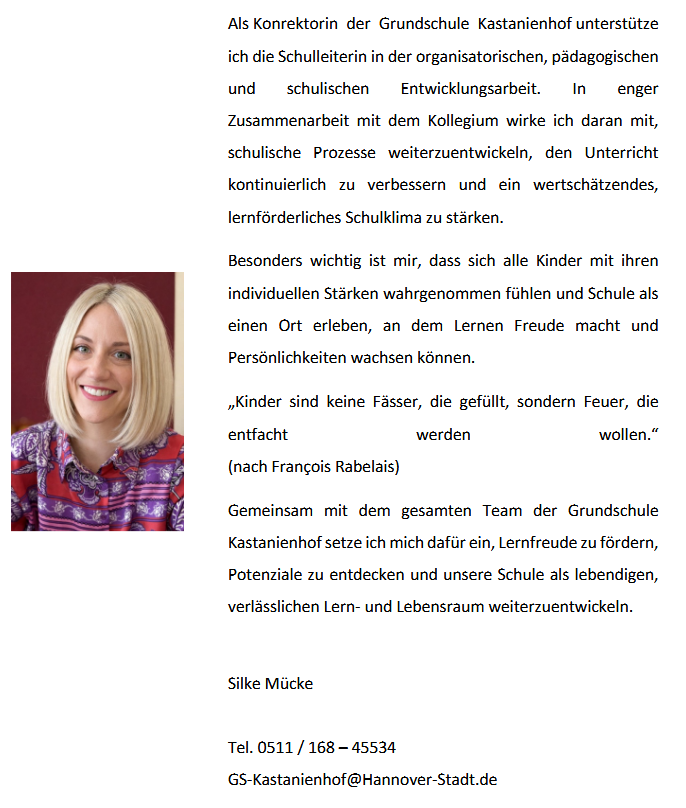 Als Schulleiterin der Grundschule Kastanienhof trage ich wie im niedersächsischen Schulgesetz (NSchG) verankert, die Gesamtverantwortung für die Schule und für deren Qualitätsentwicklung (§ 43 Abs. 1 NSchG). Die Schulleitung entscheidet nach § 43 Abs. 3 NSchG in allen Angelegenheiten, in denen nicht eine Konferenz, der Schulvorstand oder eine Fachgruppe zuständig ist. Sie führt die laufenden Verwaltungsgeschäfte; dabei hat sie u.a. die Schule nach außen zu vertreten sowie den Vorsitz in der Gesamtkonferenz und dem Schulvorstand zu führen.